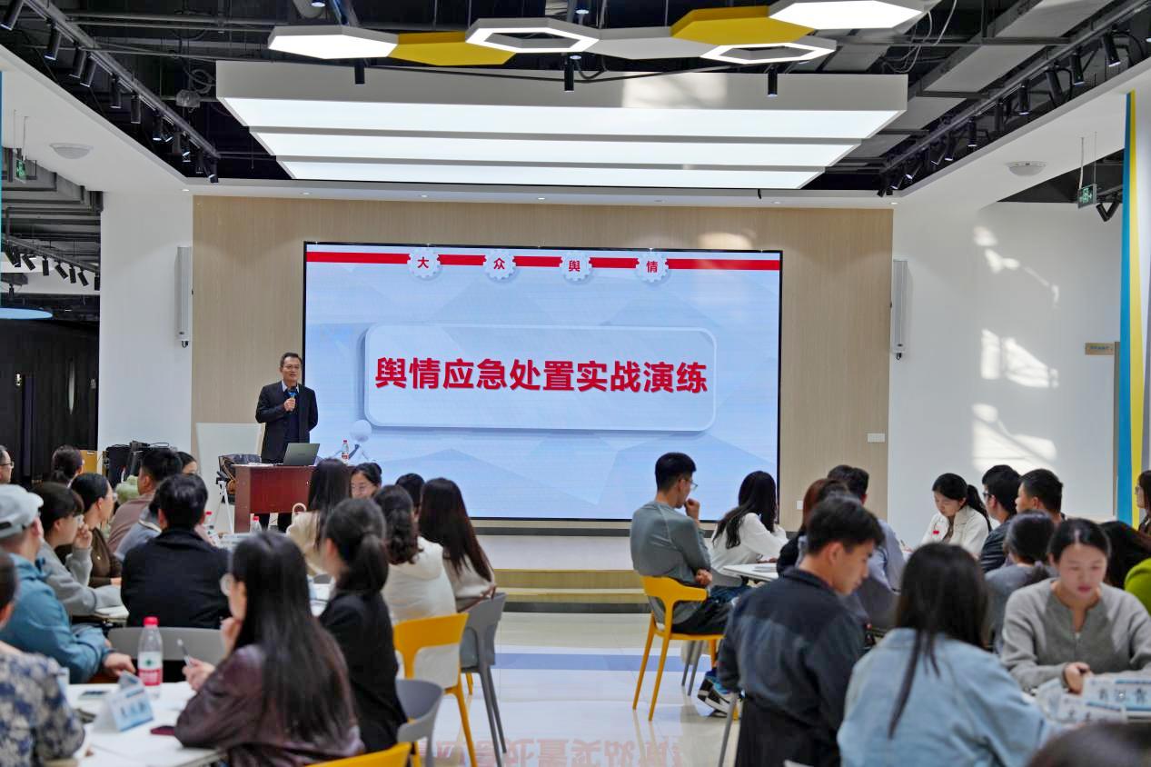 为进一步提升我校宣传思想文化工作队伍和辅导员队伍网络意识形态工作能力水平,有效防范、处置和应对网络舆情风险,切实维护网络意识形态安全,10月13日,学校在大学生就业赋能中心组织开展舆情应对能力培训与教育舆情应急处置实战演练活动。山东省互联网传媒集团舆情中心首席舆情分析师陈慧敏、李婷婷受邀作专题培训及舆情演练,学校党委委员、副校长蒋涛涛,党委委员、宣传部部长冯琨出席活动。
