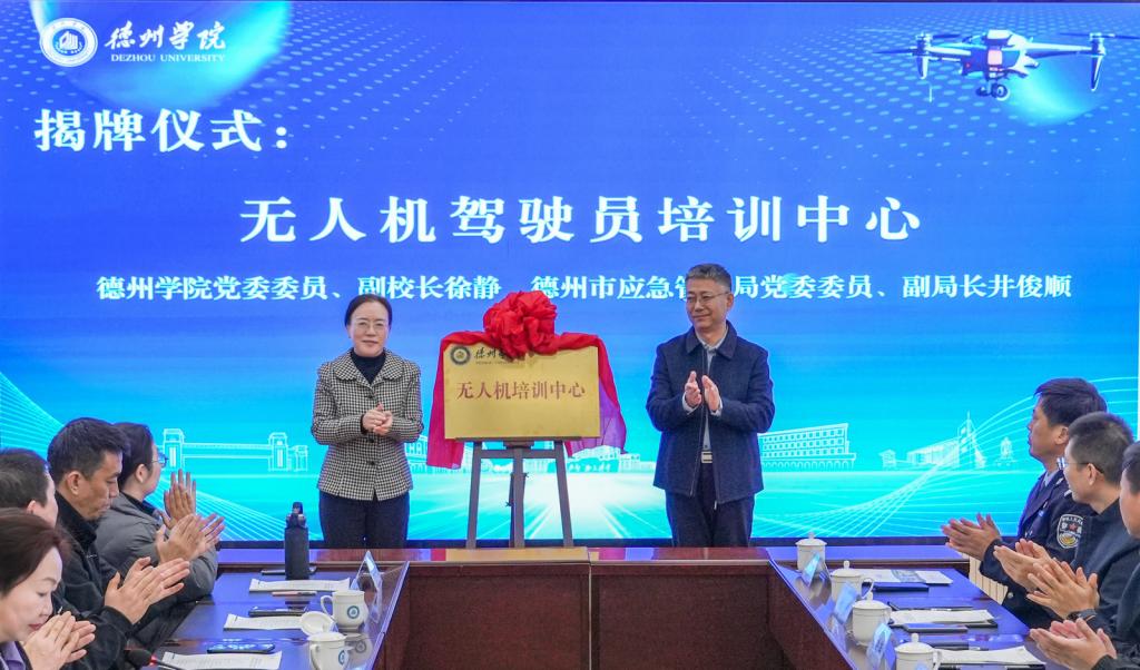 10月19日上午,德州学院举行无人机驾驶员培训中心、无人机驾驶员职业技能等级认定中心揭牌仪式,首批无人机驾驶员培训班开班。“两个中心”以“服务德州、助力低空经济”为核心,正式开启校地协同培育实用型人才的新路径。党委委员、副校长徐静,德州市应急局、供销社、人社局、城管局、公安局、国安局、区退役军人事务局等9个部门相关领导,以及学校相关部门负责人、首批学员代表参会。继续教育学院主要负责人主持。