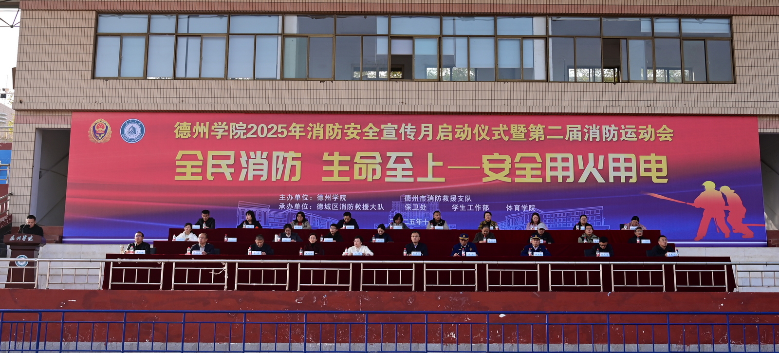 11月11日,德州学院2025年消防安全宣传月启动仪式暨第二届消防运动会在学校田径场举行。学校党委委员、副校长蒋涛涛出席并致辞,德州市消防救援支队一级督导员周勇出席并讲话,学校党委委员、宣传部部长冯琨参加活动。