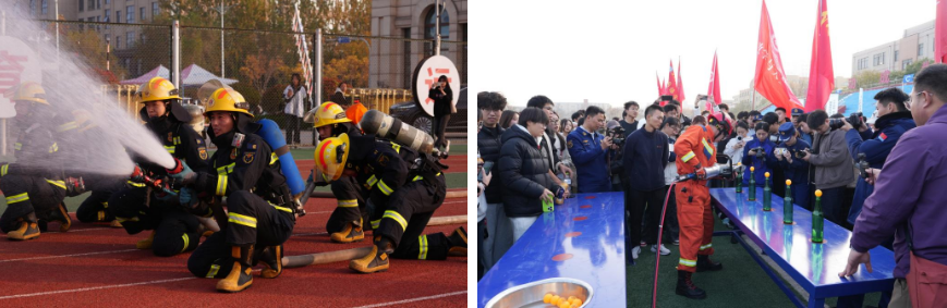 本次活动由德城区消防救援大队与学校保卫处、学生工作部、体育学院、团委联合举办。学校资产管理处、后勤管理处、实验管理中心等单位负责人及各学院党委副书记到场观摩。师生代表与第三方服务人员共300余人参赛,吸引逾千名师生驻足观看,现场气氛热烈。活动还通过“德州晚报”抖音号与视频号同步直播,线上观看人次突破2万,进一步扩大了宣传覆盖面与社会影响力。