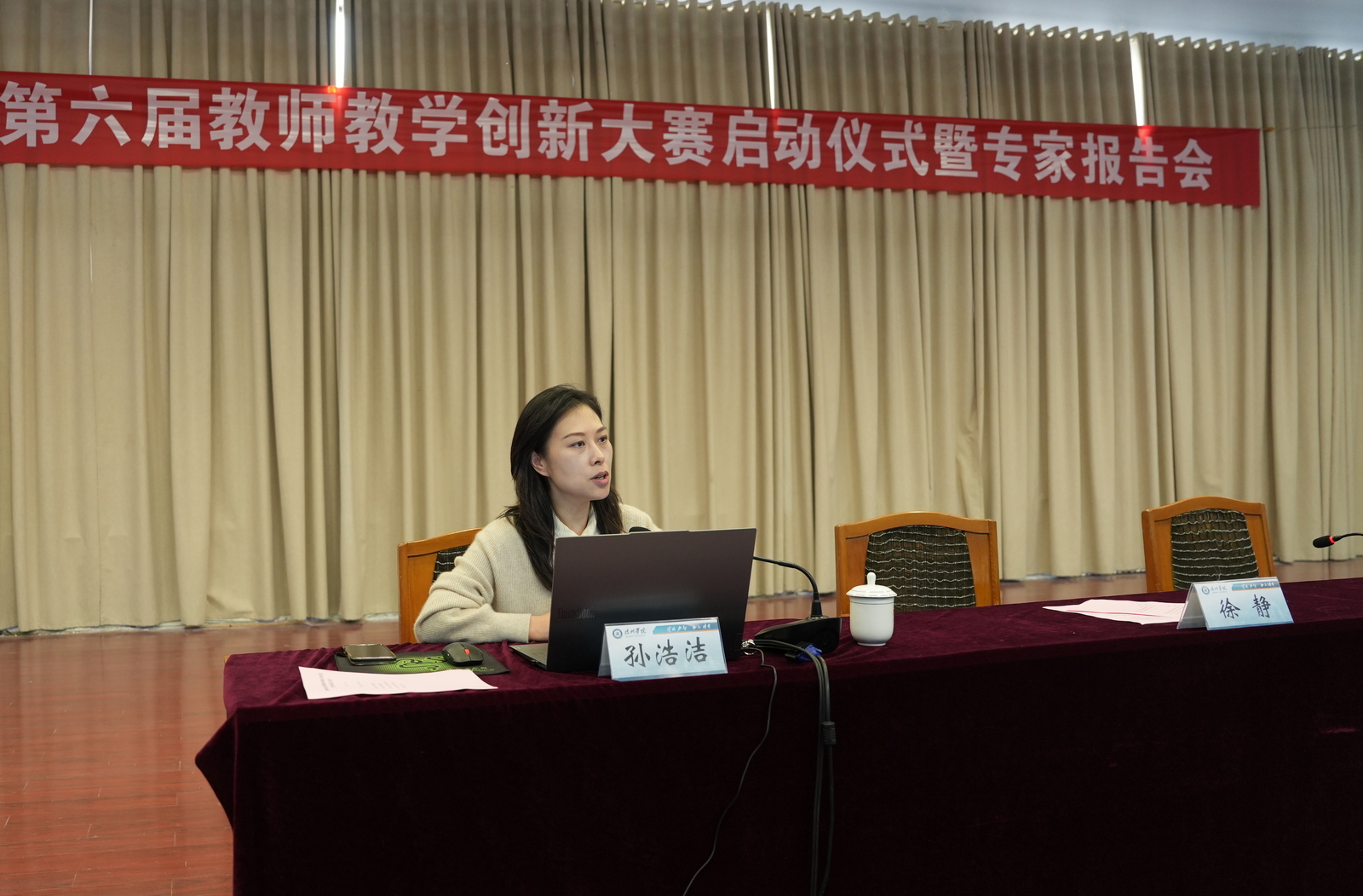 为深入贯彻落实《教育强国建设规划纲要(2024—2035年)》精神,全面提升教师教学能力。11月14日,在求实楼四楼报告厅举行第六届教师教学创新大赛启动仪式暨专家报告会。党委委员、副校长徐静出席并致辞,特邀全国教师教学创新大赛国家级二等奖获得者、山东理工大学教务处副处长兼教师发展中心主任孙浩洁作专题报告,校内专家代表及参赛教师参加会议。