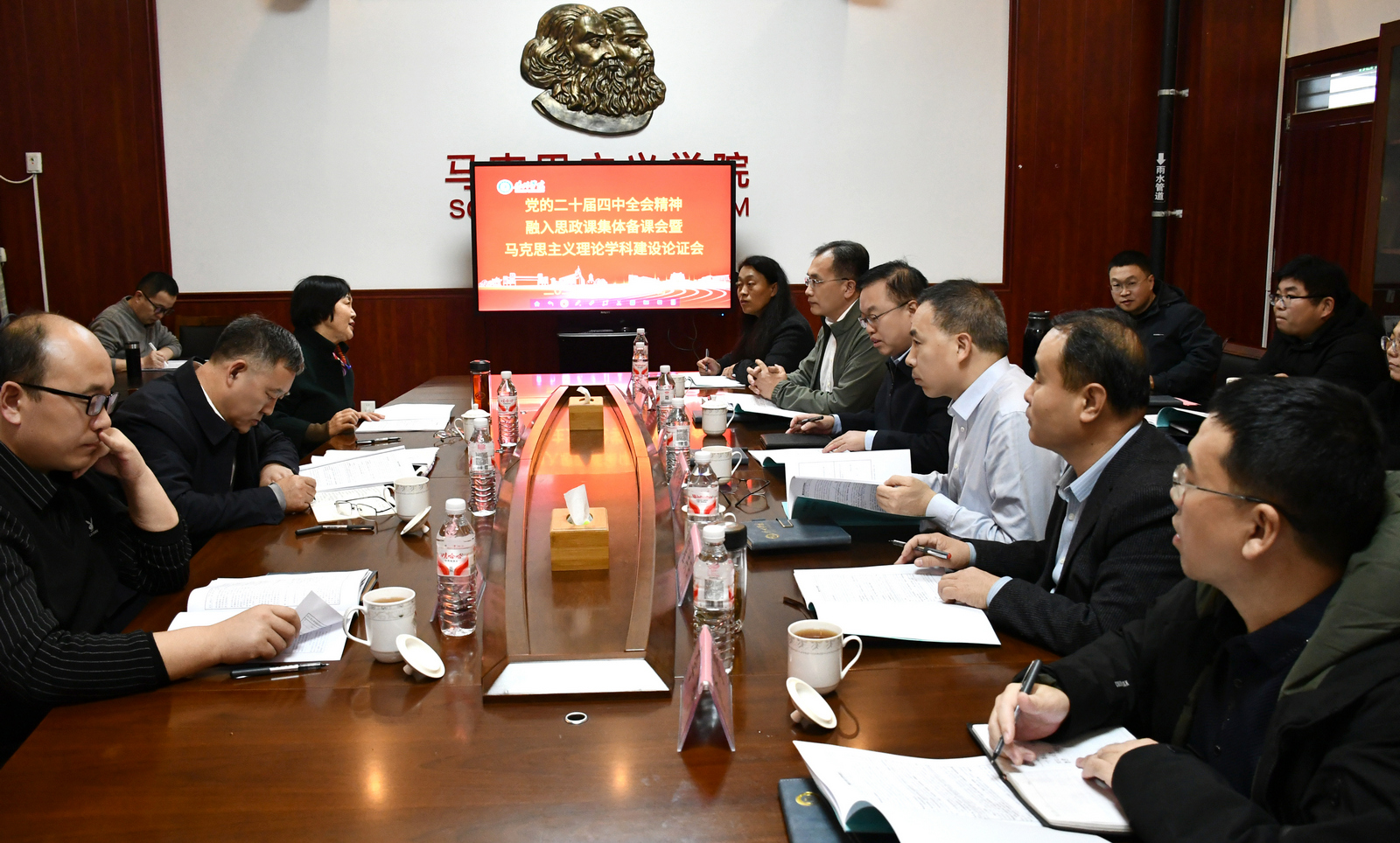 11月21日,学校在博文楼524会议室开展“党的二十届四中全会精神融入思政课集体备课会暨马克思主义理论学科建设论证会”。会议特邀第十四届全国人民代表大会代表、中国社会科学院大学马克思主义学院院长辛向阳教授,山东大学马克思主义学院副院长徐艳玲教授,山东师范大学马克思主义学院院长王增福教授等专家参会。校党委书记吴君热情接见与会专家并亲切交流;党委副书记、校长赵长林出席会议并调研马克思主义学院建设发展并提出指导意见,党委委员、副校长刘印房主持会议。