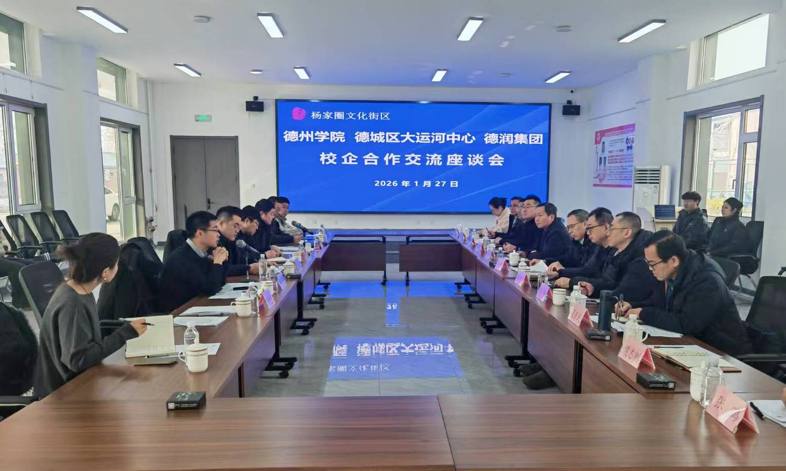 德州德润集团党支部书记、董事长、区大运河文化带发展保障中心党组成员张广辉详细介绍了杨家圈街区的运营现状及拟与学校开展合作的相关事项。德城区大运河文化带发展保障中心副主任张群介绍了大运河文化展示中心项目情况。