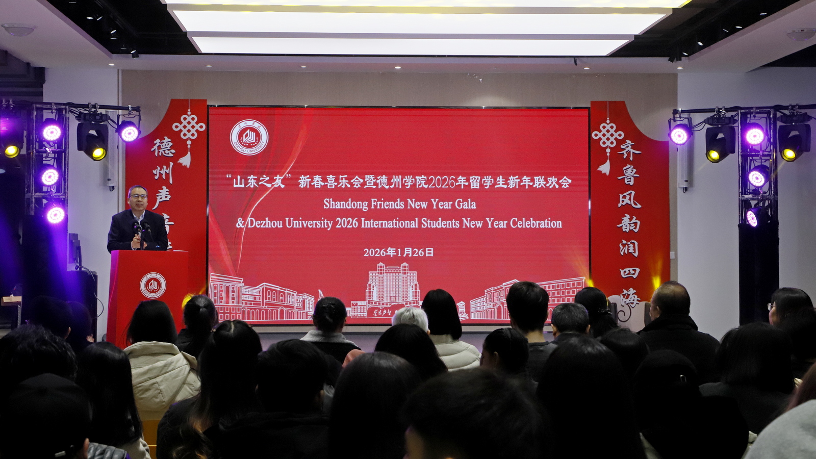 1月26日,我校举办“山东之友”新春喜乐会暨2026年留学生新年联欢会。德州市人民政府外事办党组书记、主任张方瑞,市委宣传部副部长姚宁,党委委员、副校长刘印房,与来自15个国家的200余名师生欢聚一堂,喜迎新春。