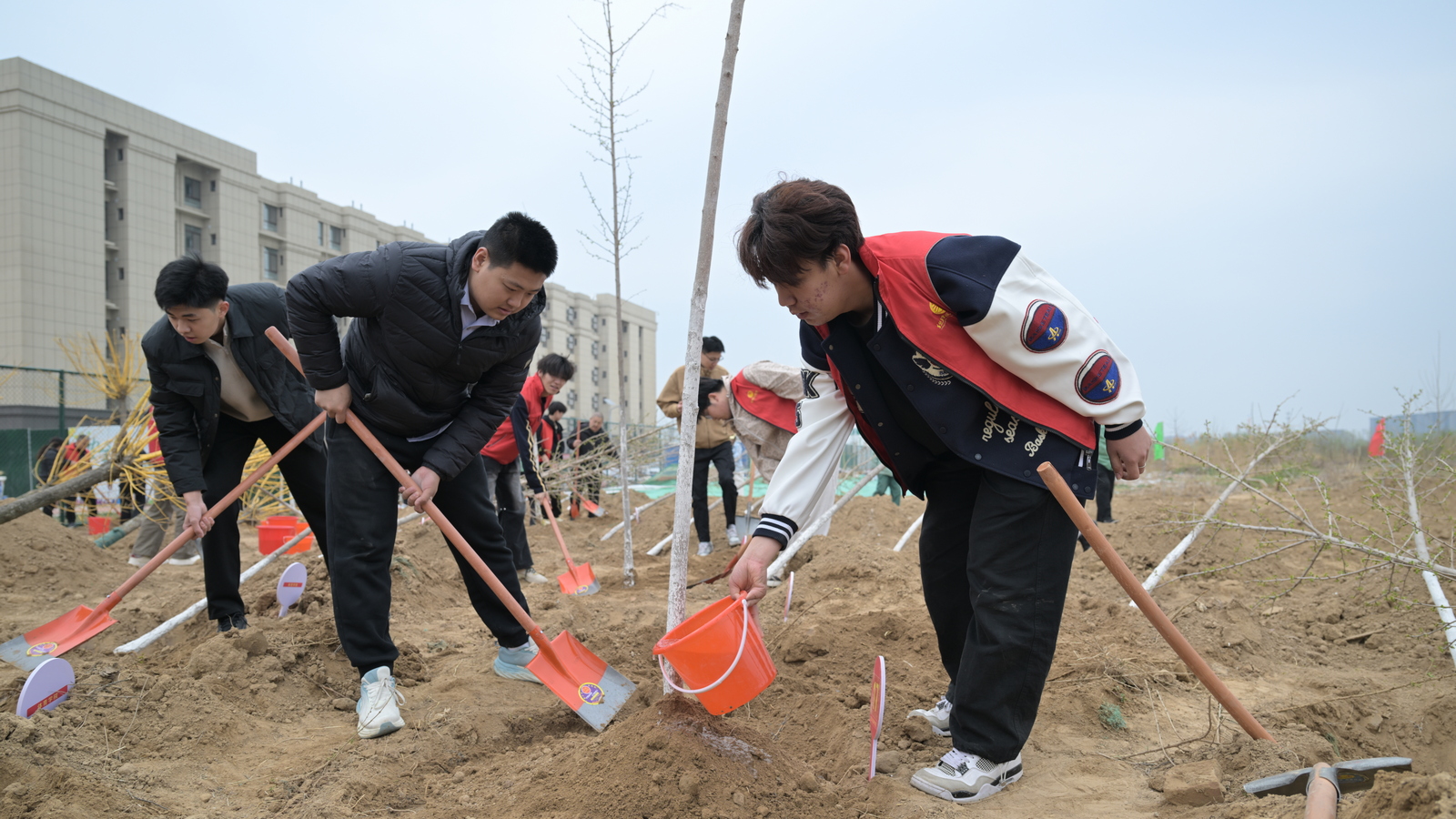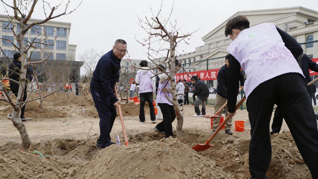 植树现场,一派热火朝天、井然有序的劳动景象。校领导与师生并肩协作,一起挥锹铲土、培土围堰、提水浇灌,每一道工序都认真细致、一丝不苟。大家分工明确、干劲十足,以饱满的热情投入到植树劳动中。经过一上午的辛勤劳作,共栽植黄金槐25棵、桃树25棵、银杏100棵,新栽苗木迎风挺立,为美丽校园增添了勃勃生机,也种下了对绿色未来的美好期许。