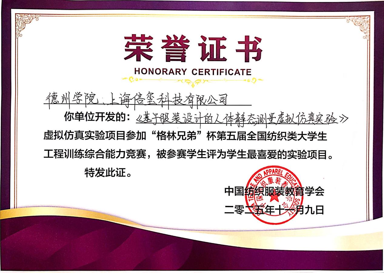 在刚刚结束的第五届全国纺织类大学生工程训练综合能力竞赛中,纺织服装学院开发的“基于服装设计的人体静态测量虚拟仿真实验”作为比赛项目,荣获服工组“学生最喜爱实验项目”。
