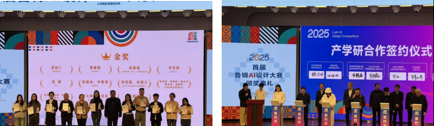 活动现场,纺织服装学院负责人与山东睿尚鲁锦纺织有限公司负责人签署产学研合作协议。此次签约是学院响应大赛 “创意设计 + 数字技术 + 实体产业” 协同发展理念的具体实践,标志着双方将在鲁锦创意设计、AI 技术应用、人才联合培养、科研成果转化等方面开展深度合作,为学院学子搭建实践锻炼平台,也为鲁锦产业高质量发展注入新动力。