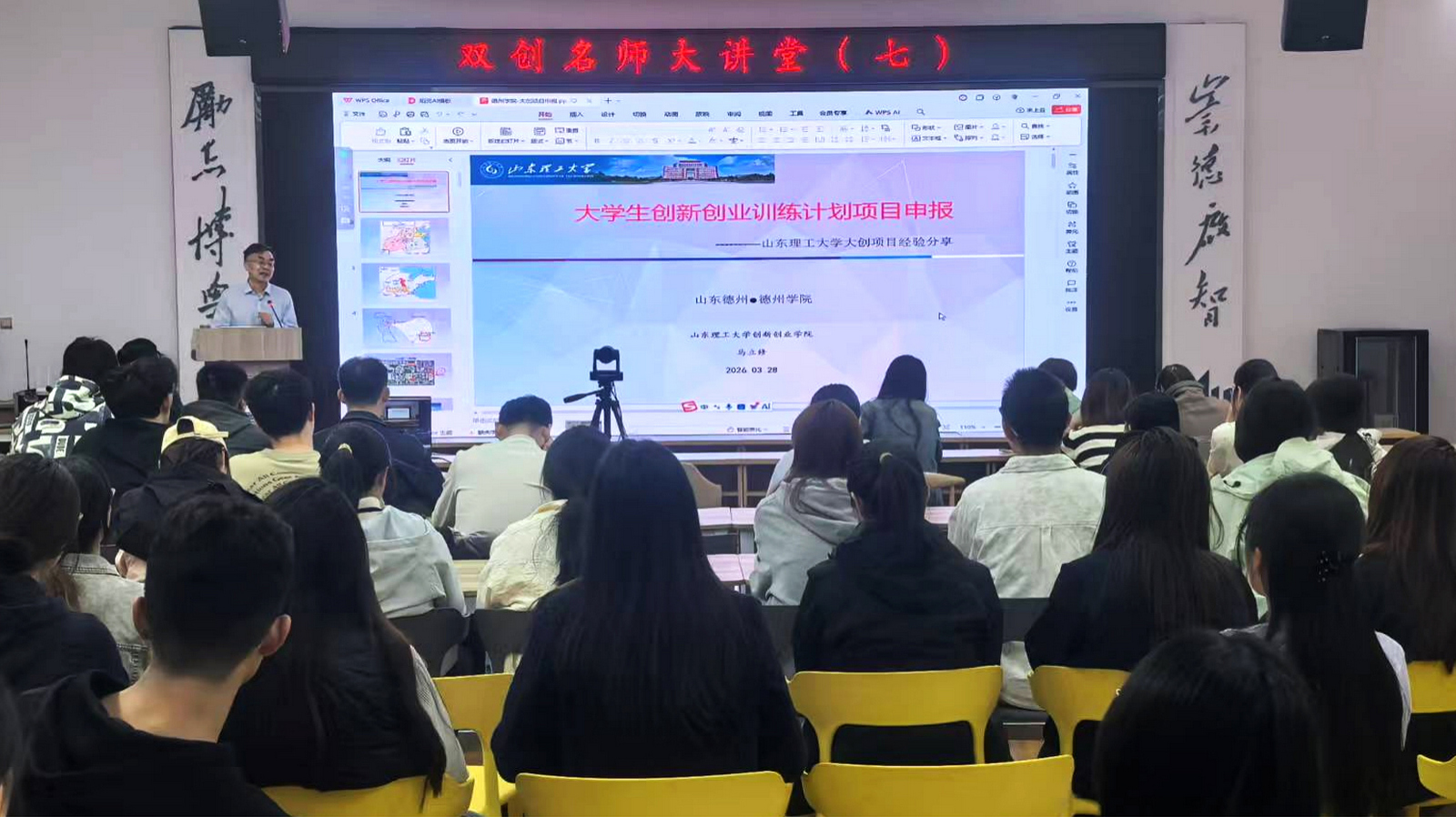 3月28日,由创新创业学院、学生工作部、团委主办的“德州学院双创名师大讲堂系列讲座(第七期)”在七点创业谷路演厅举办,山东理工大学协同创新教育研究中心主任、创新创业学院副院长马立修教授为我校师生做了“大学生创新训练计划申请书撰写指导”的主题报告。入围2026年第三轮大创项目的指导教师、项目负责人等100余人聆听了讲座。