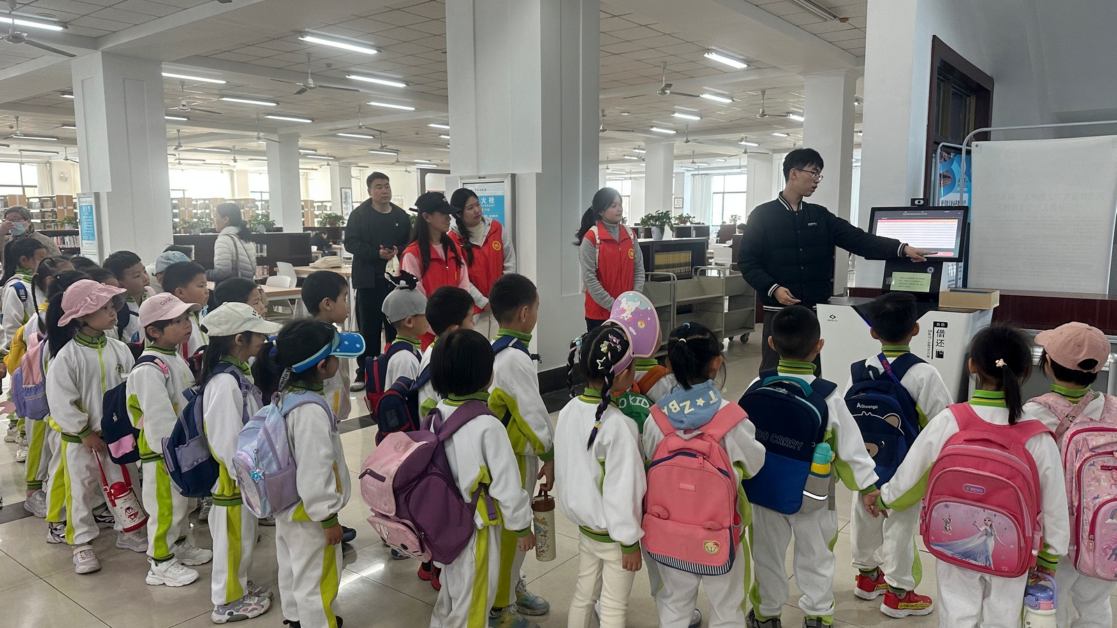 活动现场,图书馆工作人员与大学生志愿者化身 “阅读向导”,用生动童趣、浅显易懂的语言,带领小朋友们依次参观图书馆大厅、繁露书房、自助借还区、特色书库及文化展示区,从图书馆的功能布局、馆藏文献的丰富多样,到图书分类、借阅流程、安静阅读的文明礼仪,孩子们在沉浸式体验中好奇提问、认真聆听、亲手触摸,近距离感受高校图书馆的知识魅力与学术氛围。在自助借还设备前,小朋友们亲自体验图书借阅、归还的智能操作,感受现代科技为阅读带来的便捷,稚嫩的脸庞上洋溢着探索新知的喜悦。
