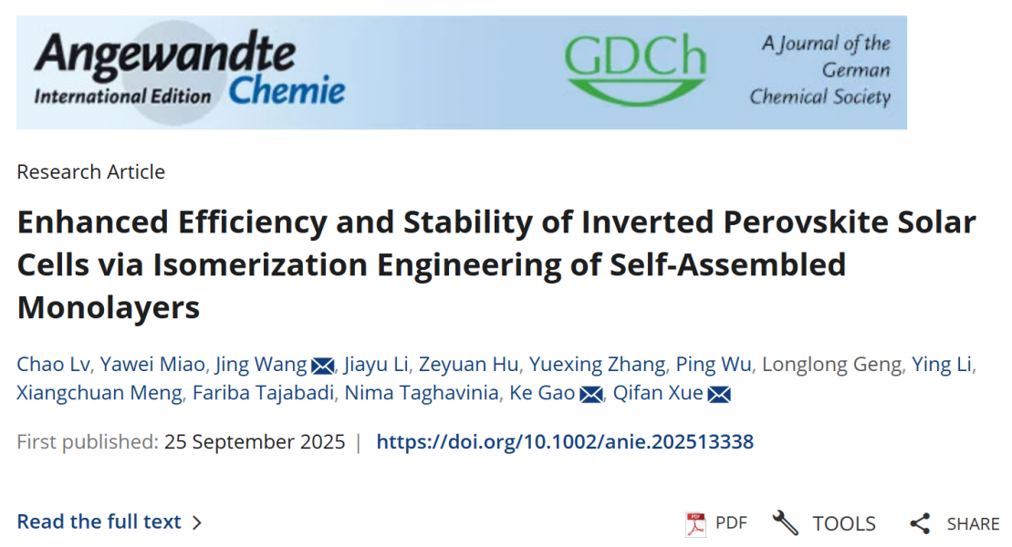 近日,我校化学与化工学院吕超副教授及其合作团队在化学领域国际期刊 《Angewandte Chemie International Edition》(影响因子16.9,中科院一区top)上发表题为“Enhanced Efficiency and Stability of Inverted Perovskite Solar Cells via Isomerization Engineering of Self-Assembled Monolayers”的最新研究成果。该工作是德州学院以第一单位在Angewandte Chemie International Edition上发表的首篇论文。