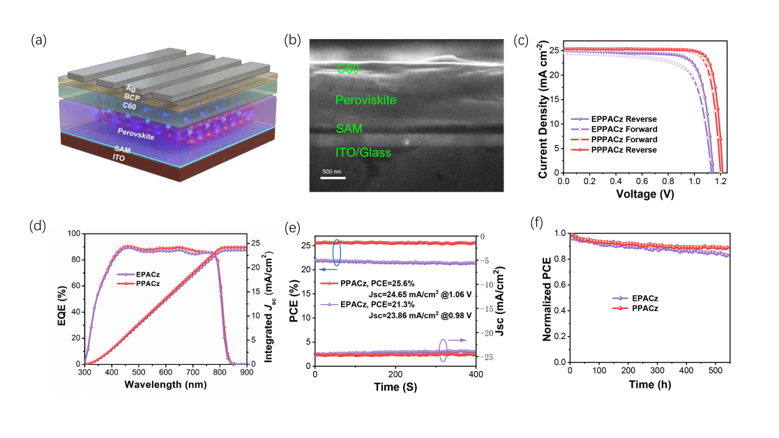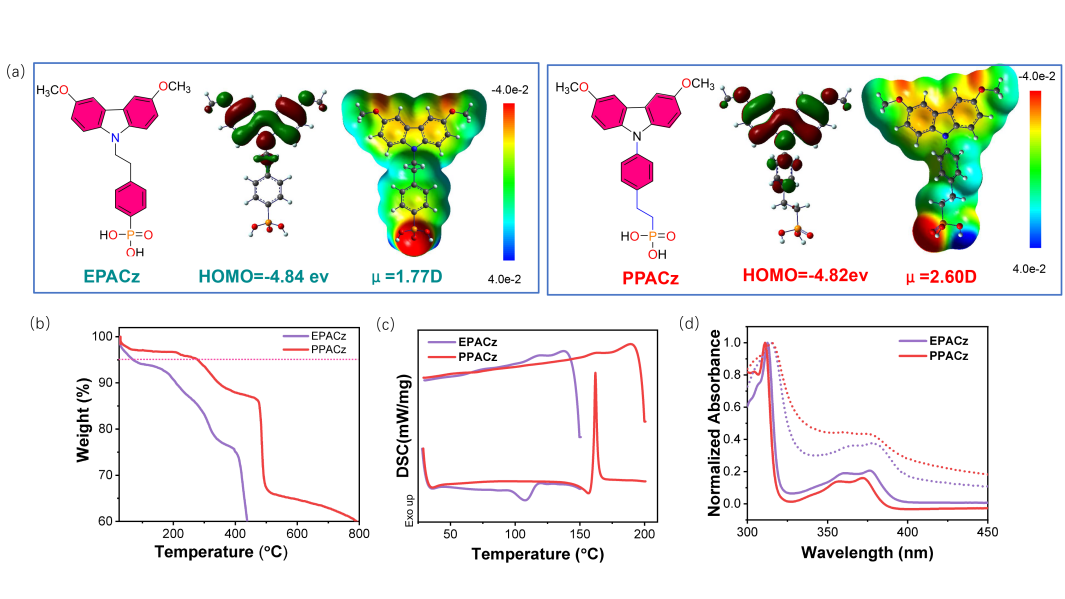 该研究团队首次通过异构化分子设计策略,实现了自组装单分子层(Self-Assembled Monolayers, SAMs)在倒置钙钛矿太阳能电池中的性能重大提升。研究团队通过对比合成的两种异构化咔唑类分子(EPACz与PPACz),发现PPACz具有更高的分子偶极矩、更优的能级匹配和更致密的界面组装结构。