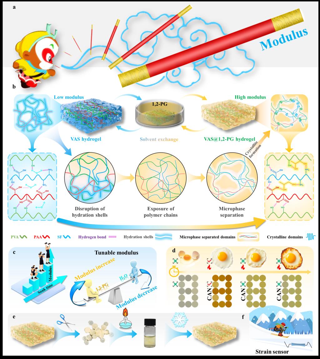 近日,该团队提出了一种“醇析效应”的新思路,通过醇-水置换制备了自增强水凝胶,实现了水凝胶新材料的模量可调、高抗冲、可回收以及三重信息加密。将水凝胶浸泡于1,2-丙二醇(1,2-PG)中,调控浸泡时间实现了模量从kPa至MPa的精准调节。通过溶剂置换诱导聚合物链形成纳米级微晶域和多重氢键网络,有效增强了材料的力学性能。置换后的水凝胶展现出卓越的强韧性与抗冲击性能以及优异的抗冻性。此外,所设计的材料可实现模量的“高-低”循环调控,具有良好的可回收性能,契合绿色材料的设计理念。研究团队使用硝酸铈铵溶液,开发了时间/紫外/温度三重响应的集成防伪新方法,用于动态信息隐藏与“阅后即焚”式加密显示。该工作以我校与济南大学联合培养硕士研究生赵相磊作为第一作者,顾相伶教授为通讯作者,10月27日以“Self-Reinforced Hydrogel via Alcohol-Water Exchange: Tunable Modulus, High Impact Resistance, Recyclability, and Triple Information Encryption”为题在线发表(Xiangling Gu*, et al, Adv. Funct. Mate., 2025, e23269)。