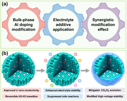 富镍层状氧化物是高能量锂离子电池的核心候选正极材料,但高压循环下的严重结构退化与界面不稳定问题,长期制约电池实际应用与性能升级,成为行业亟待突破的技术瓶颈。针对这一关键痛点,团队创新性提出“协同正极-电解质工程(SCEE)策略”,通过“铝元素晶格掺杂+多组分电解质优化”的双维度协同设计,借助二者的协同调控实现高容量与结构耐久性的精准平衡,通过铝元素的精准掺入减少阳离子混排、稳定层状结构并拓宽锂离子传输通道,利用含FEC、LiDFOB、LTBA的多组分电解质添加剂优先分解,形成致密无机CEI界面,有效抑制氧相关副反应、减轻电解质分解、缓解循环机械应力,从根源上破解界面不稳定难题。