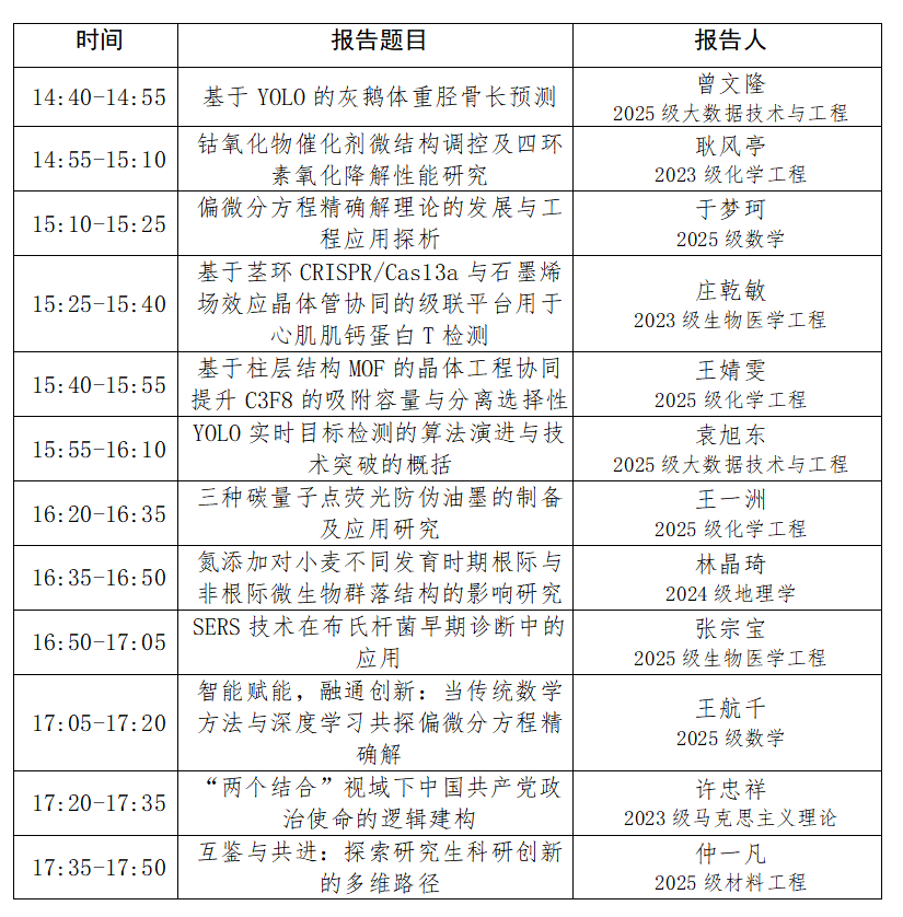 为培育研究生科研创新能力,搭建学术交流平台,助力研究生互学互鉴、启迪思路,拟举办2026年度第一期研究生科研创新论坛。诚邀各位领导、老师莅临指导,欢迎广大同学踊跃参与,共赴学术之约、共启创新之路!