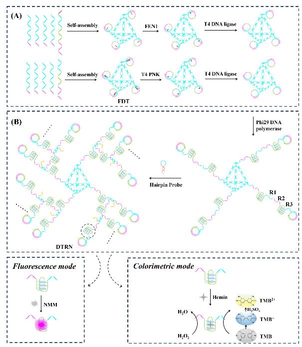 DNA修复酶在维持基因组稳定性中发挥关键作用,其活性异常与癌症发生、耐药及预后密切相关,已成为重要的疾病生物标志物。现有检测方法局限于单模式检测,不利于检测结果的交叉验证和准确性提升。为此,研究团队提出了一种DNA四面体发射的纳米网络,用于两种DNA修复酶活性的双模式检测。该策略以DNA四面体纳米探针为核心,在DNA修复酶催化瓣状切割和磷酸化反应后,触发多级级联滚环扩增反应,生成纳米网络。纳米网络的生成将荧光信号有效聚集,进一步提高荧光检测模式下的灵敏度;同时利用纳米网络的催化特性,将TMB有效催化,产生可检测的比色信号。该研究工作提出的双模式检测策略,通过荧光信号聚集与比色信号催化的协同互补,显著提升了对癌症相关生物标志物的灵敏度和检测范围的适应性。