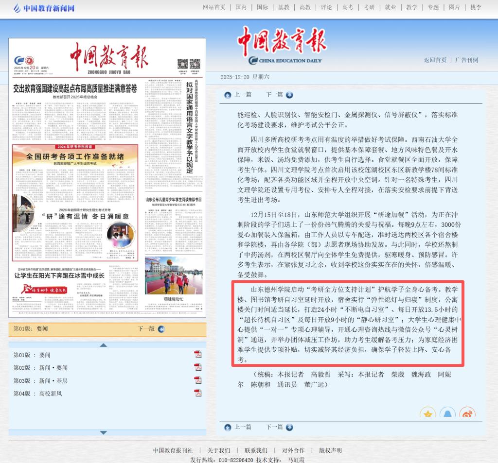 12月20日,2026年全国硕士研究生招生考试正式开考。当日,《中国教育报》第1版2026年研考特别报道以《“研”途有温情 冬日涌暖意》为题,综合报道了我校助力考研学子安心备考、顺利应考所开展的系列暖心举措,生动展现了我校“以学生为中心”的教育理念与深厚人文关怀。相关原文如下: