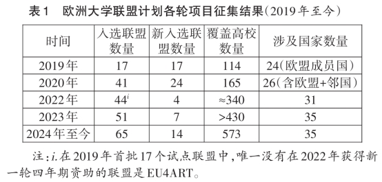 2019年欧洲大学联盟首轮试点启动,欧盟从54个申请联盟中遴选出17个,涉及24个国家114所高校,并投入专项经费支持联合校园、学位互认、治理协同等建设任务。随后,联盟规模不断扩大。2020年,第二批联盟入选后,欧洲大学联盟增至约41个,涵盖280余所高校。2022年,第三、四轮项目鼓励现有联盟扩展伙伴范围并组建新联盟。联盟规模的扩展情况见表1。
