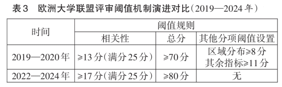 评估标准采用百分制评分体系,随着政策重点动态调整。2019—2020年试点阶段的评估共有五项指标:相关性、区域分布、申请与实施质量、合作方案质量及可持续传播,分值分别为25、15、20、20、20,总分需达到70分以上,并满足各项最低分要求,评分重点考察项目的合规性与区域代表性。自2022年起,欧盟将评估标准整合为相关性、质量和影响力三类(25分、50分、25分),其中质量含项目设计实施与伙伴合作两项,各占25分,评估导向由参与转向绩效。(见表3)评审工作由欧盟教育、视听与文化执行署(EACEA)组织的独立专家组进行,成员包括学科专家(40%)、高校管理者(30%)、产业代表(20%)及学生代表(10%)。