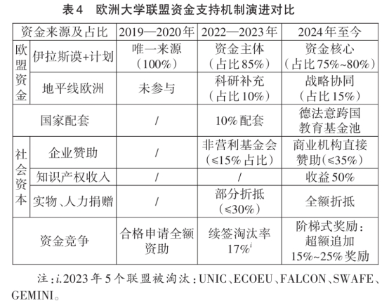 在运行支撑方面,欧洲大学联盟可获“伊拉斯谟+”专项资助。首批联盟平均获得约500万欧元资助。在最新一期“伊拉斯谟+”(2021—2027年),单个联盟四年内最高可获1440万欧元资助,是试点阶段资金的近三倍。联盟还可通过“桥接资金”在资助期结束前延续相应资金支持。为增强联盟科研协同与创新转化能力,部分联盟还获得了“地平线2020”(Horizon 2020)及“地平线欧洲”(Horizon Europe)项目的配套资金支持,每个联盟科研板块最高可得200万欧元。自2022年起,各成员国还设立配套拨款并引入绩效挂钩机制。(见表4)至2024年,联盟资金体系形成由欧盟预算、国家财政与社会资本组成的多元资金池,实行跨领域调配与阶梯激励,推动资金分配向绩效导向与灵活调控转变。